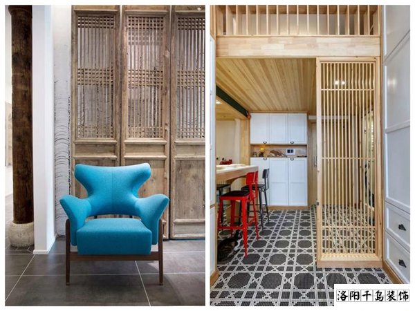 硬裝上會用復古的元素裝飾墻面或地面。比如充滿中國風的木門。