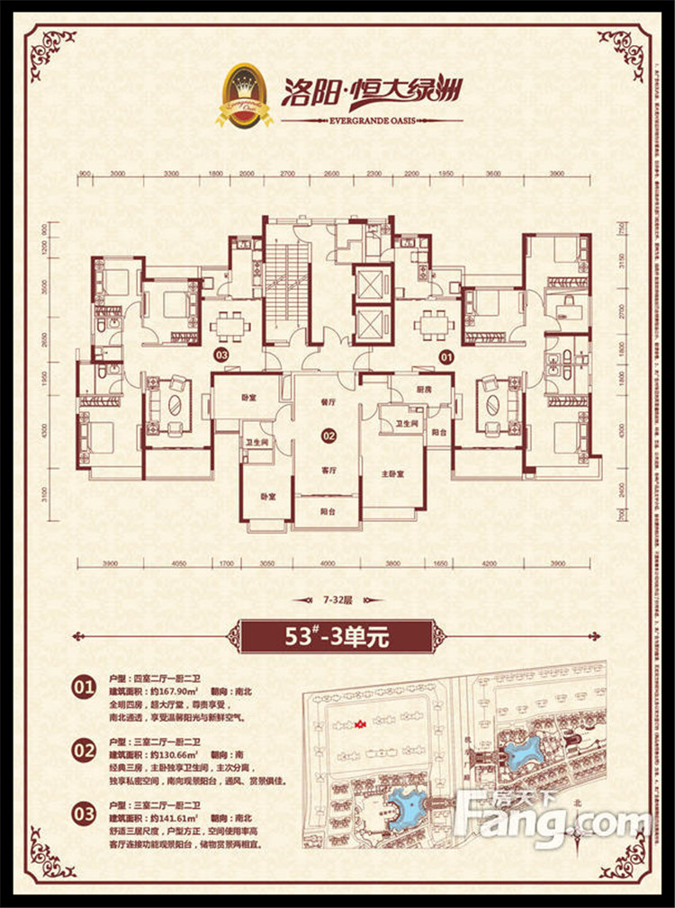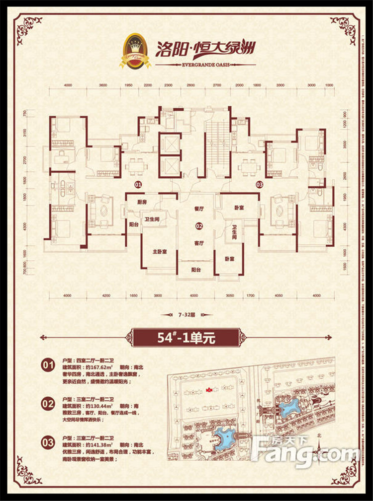 恒大綠洲項目位于洛陽市瀍河區洛陽市東出口,洛河以北、中州東路兩側、二廣高速以西,項目獨享洛河北岸3500多米河岸線,且處于洛陽市城市東西中軸線中州路東段,臨中州路街面長2000余米,有多路公交車直達。恒大綠洲全部項目占地面積約1338畝,規劃建筑面積近301萬平方米,居住單位2.06萬余戶,除居住建筑外,項目內還配置了運動中心、綜合樓(會所)、幼兒園、小學、中學、商業配套、五星級酒店等,整個項目建成后,將形成約6.6萬人的居住規模。全部項目累計總投資超過100億元人民幣,預計上交稅收超過15億元人民幣。