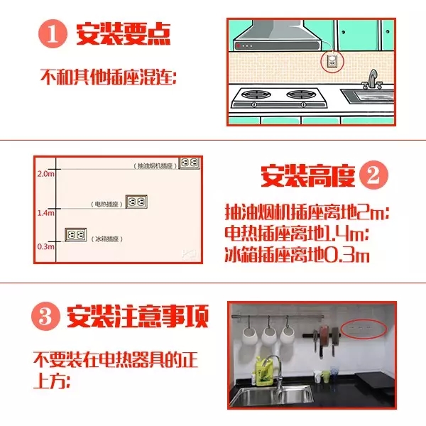 廚房內(nèi)所用電器較多,所以在進(jìn)行電路改造時(shí),一定要想清楚廚房內(nèi)會(huì)有哪些電器,具體位置在哪里,想好哪里應(yīng)該預(yù)留電線接口,廚房應(yīng)根據(jù)建筑裝修的布置,在不同的位置、高度設(shè)置多處電源插座以滿足抽油煙機(jī)、消毒柜、微波爐、電飯煲、電熱水器、電冰箱等多種電炊具設(shè)備的需要。這樣就不會(huì)留下裝修遺憾。