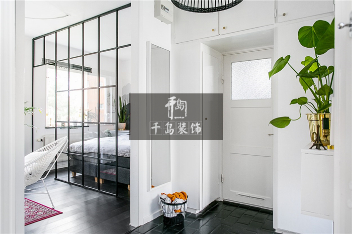 可以明顯看出,客廳與臥室只用了一道黑框玻璃門隔斷,透明光感增加了整體環境的通透性,但黑色的框線卻強調了兩個空間,線條明朗交錯之間,既有北歐風的自由風情,又有輕工業的規整有序,這種輕微卻極具沖擊力的混搭效果讓人眼前一亮。