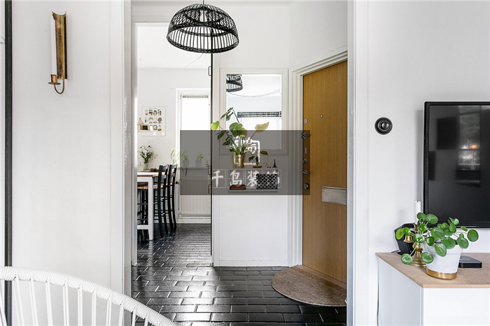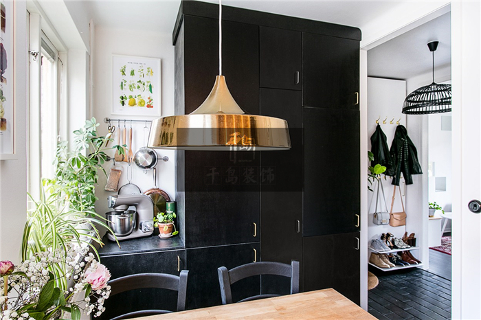 浴室在餐廳與客廳之間,為了避免中間的通道過于單調,屋主在頂部設計了一盞鐵藝吊燈,寬大的燈罩搭配鏤空的線條,能夠恰到好處地充盈空間,又不會顯得過于笨重。純黑的色澤與黑色磚面相互映照,又與白色墻面相互對比,無處不產生碰撞的美感。