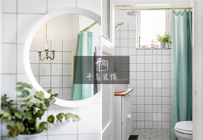 浴室之中采用了為常見的鋪磚處理,白色的格紋磚是北歐風家居常見的元素之一。在大空間上保持北歐風格占據主體地位,但細節之處卻利用金屬元素修飾。依舊是空間上相互照應的手法,浴簾橫桿豐富頂部空間,金屬壁燈裝點墻面留白,對比之間輕松打造出混搭家居。