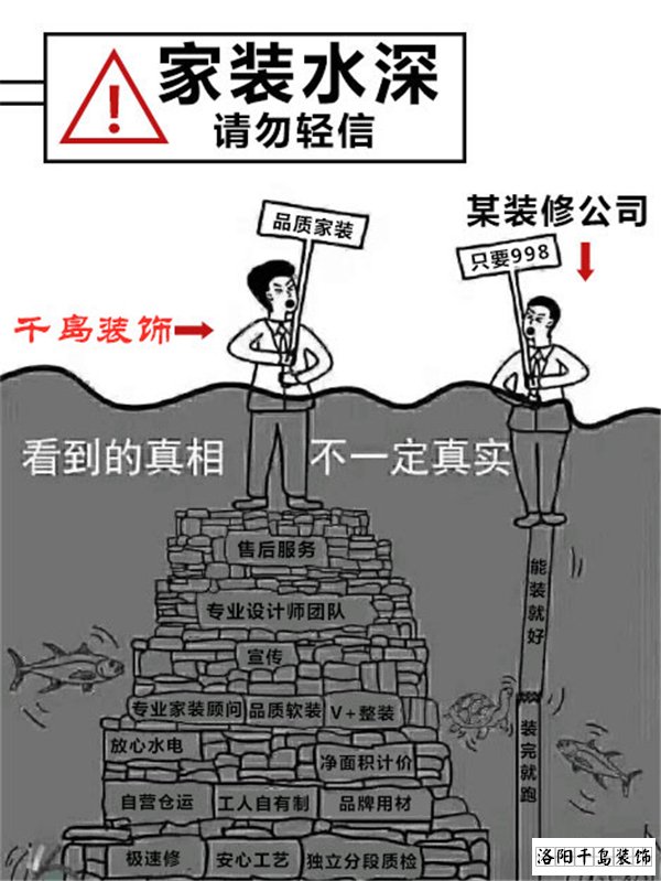 最后,小編想說的是:選擇裝修公司沒有品牌優(yōu)先,不管公司大小,都有好的也有壞的,我們還要對裝修公司進(jìn)行充分的考察,其實(shí)價格的背后包含了很多東西:材料品質(zhì)、施工工藝、施工質(zhì)量、售后服務(wù)、品牌價值等等,口碑才是一種無形的力量,這就是我們千島裝飾為什么這么多年一直沒有業(yè)務(wù)員,但是卻一直能夠生存下來得原因,良好的口碑就是我們真實(shí)的廣告。