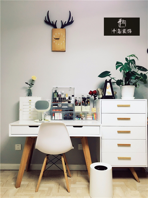 作為一個(gè)美妝愛好者,化妝區(qū)怎么可以不夠大!妝臺(tái)實(shí)際上是個(gè)書桌,配上同系列的斗柜收納各種囤貨,每天坐在這里心情都格外舒暢啊~