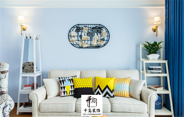 簡單的黃色能在淺色系的裝修中起到很好的點綴效果。淡藍色的有色乳膠漆作為背景墻,搭配素色的布藝沙發,黃色的沙發靠枕,一下子給簡單素雅的客廳帶來了一絲活力,給人悠閑恬靜的感覺。