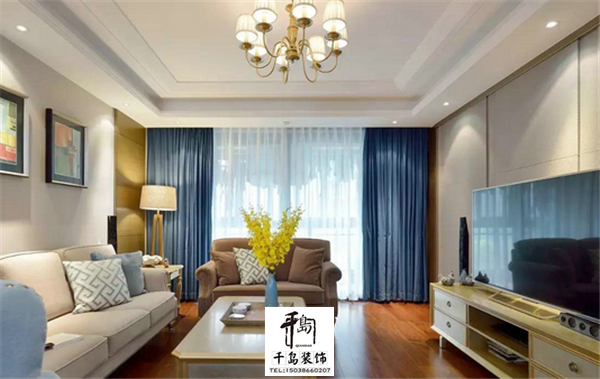 客廳中,簡單白色的石膏板,布藝沙發搭配淡藍色的抱枕,深藍色的遮光窗簾加上一層紗窗有,銀黃色木質茶幾和電視柜,搭配藍色瓶底和黃色仿真花,色系上銜接的恰到好處。