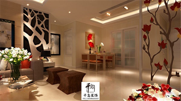 現代裝飾中,紅色的簡單扇形掛畫與紅色的玫瑰藝術玻璃銜接,在玄關處作為隔閡,給人一種眼前一亮的感覺。沙發上紅色的抱枕,配上茶幾上白色純潔的花束,給人一種溫馨的感覺。