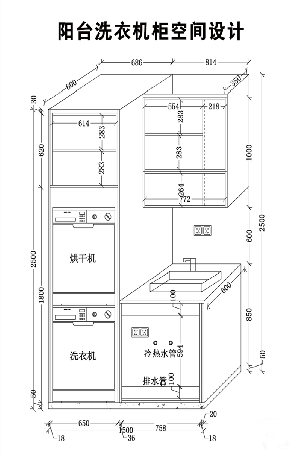 4、洗衣機柜內空尺寸:根據洗衣機高和寬來定,提前定好洗衣機和烘干機尺寸