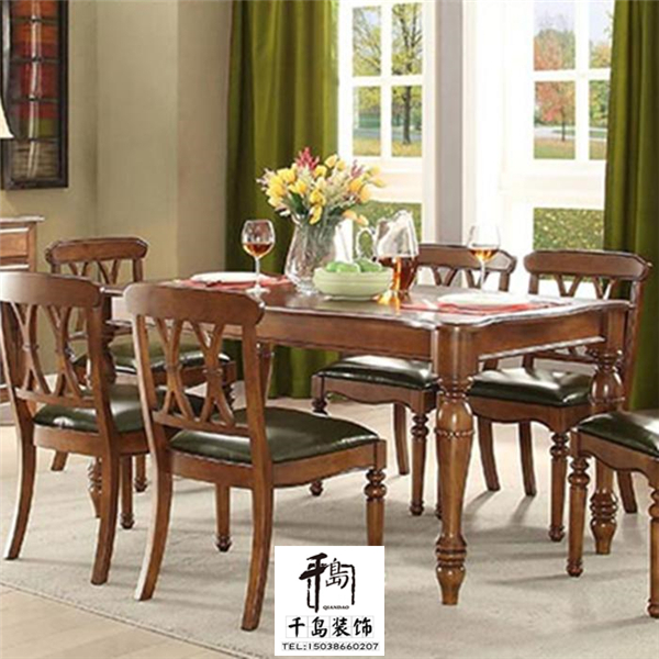 餐廳是具浪漫情調的地方,圍坐在浪漫的美式餐廳中,一頓浪漫的燭光晚餐,似乎自己就是電視劇里的主人公,餐桌的選擇非常的重要,不僅要美麗浪漫,也要耐用健康,美式鄉村風格的實木餐桌,精選的優質實木材,精心打磨成圓潤精致的餐桌和餐椅,椅子上優質的油蠟皮,坐感柔軟舒適,造型沉穩大方,彌漫著濃濃的美式風情。