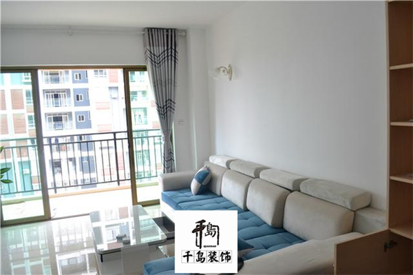 客廳的墻面就是刷大白,沒有其它的裝飾;地面是普通的大地磚;陽臺是開放式的陽臺,安裝了一個玻璃推拉門。下面是客廳的整體效果。