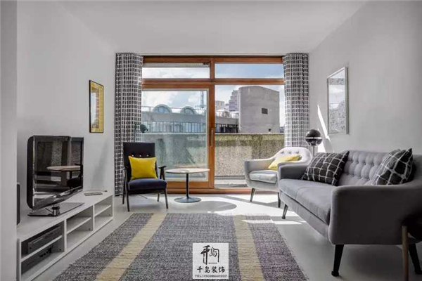 客廳的家具、布藝材質都是灰白系的淡雅色調,布藝上的格子印花增添紋理感,點綴色彩的巧妙做法是靛藍色與淺灰色單人沙發上,各放了一個檸檬黃的枕頭,使這片淺色調區域有了視覺焦點。