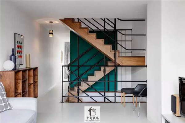 采光條件較差的樓梯空間,墻面被刷上了青綠色,進一步凸顯出棕木色樓梯的原木質感,并在黑色扶手與白色墻面之間起到了過渡作用。美美的墻邊柜空間也少不了小清新色彩裝飾畫的點綴。
