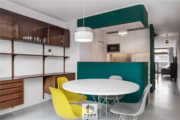 可以看到整個空間的鮮亮色彩不會超過三種,在統一中尋求獨立個性,黃白混搭的餐椅,部分刷上青綠色漆的櫥柜吧臺,在與留白之間的色彩切換,充滿節奏感。