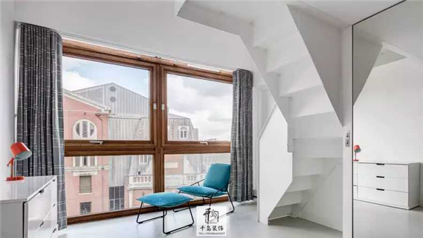 在二樓的落地窗旁,如此充滿陽光與詩意的角落,當然得放上舒適的躺椅,愜意得享受窗外景色和陽光啦!柜子上的臺燈和躺椅更是組成了紅藍色彩CP~