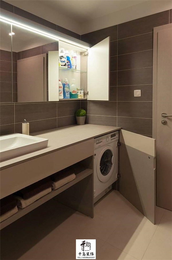 小戶型的衛浴間比較小,而且還和臥室相連,衛生間里的物品十分的多,像洗衣機這樣的大型電器一定要想好位置放置,所以衛浴的收納變得尤為重要,整齊的收納隔柜,讓毛巾和家中的瓶瓶罐罐都有了容身之所,十分的貼心。