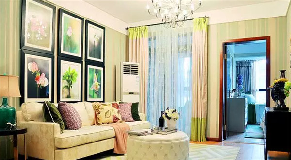 把自己的攝影作品加入自家的墻面裝飾,以花為主題,貫穿家的整體搭配,經濟又獨特.墻紙的顏色跟窗簾地毯進行呼應,一個綠意濃濃的客廳溫馨又舒適。